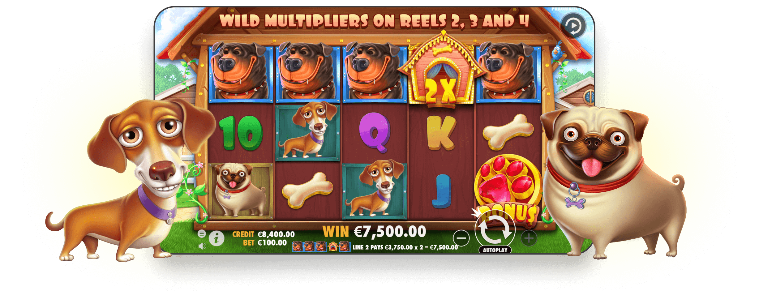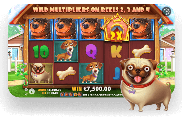 Во время игры вас будут сопровождать невероятно милые жители дома – собачки, каждой из которых дизайнеры Pragmatic Play придумали собственный характер и индивидуальность. Веселый и озорной мопс, игривый ротвейлер, спокойная и выдержанная ши-тцу, меланхоличная такса – ни один пес не оставит вас равнодушным.
